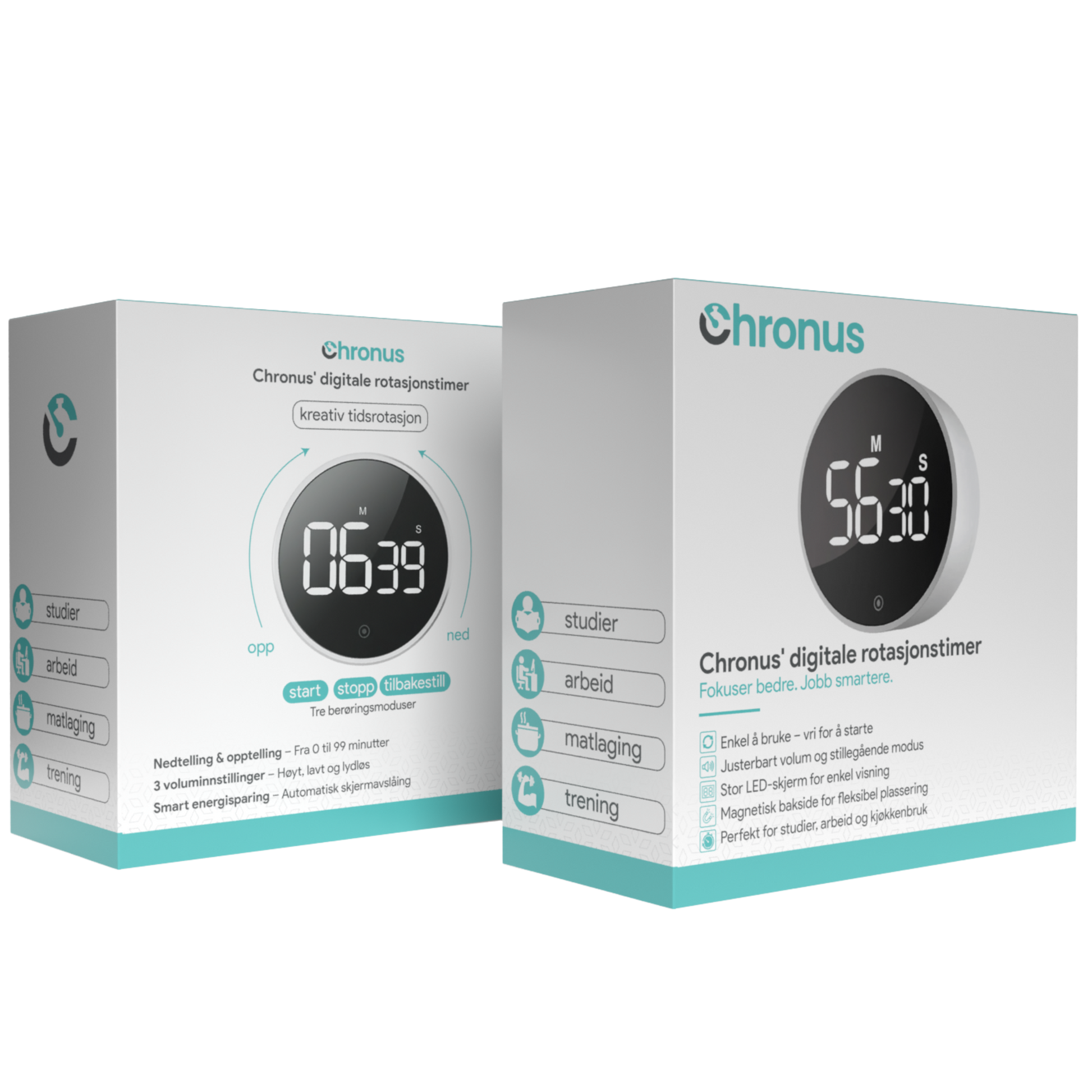 Chronus’ digitale timer hjelper deg med å holde fokus, jobbe effektivt og bruke tiden på det som faktisk betyr noe. Perfekt for studier, arbeid, kontoret og kjøkkenet.